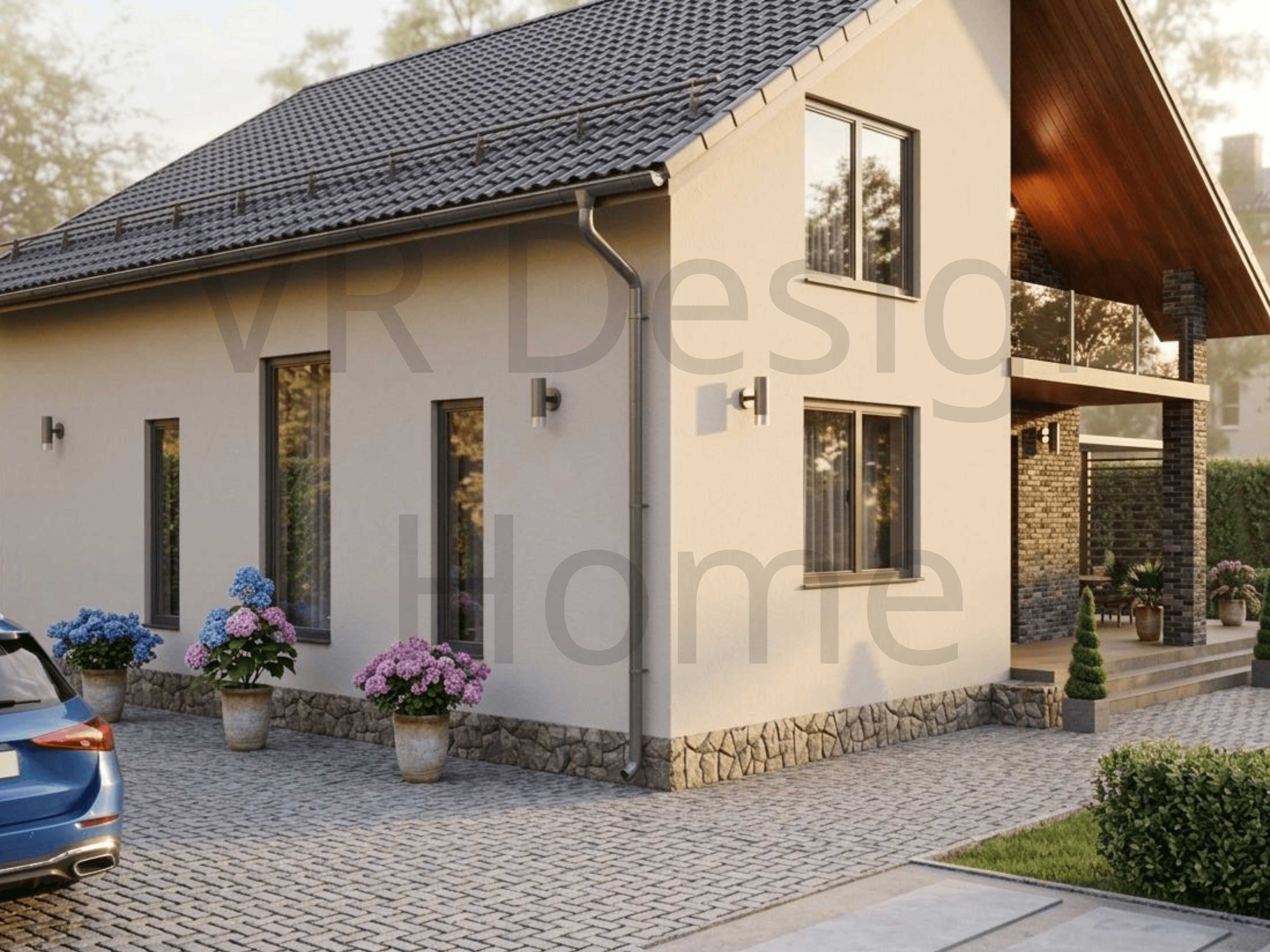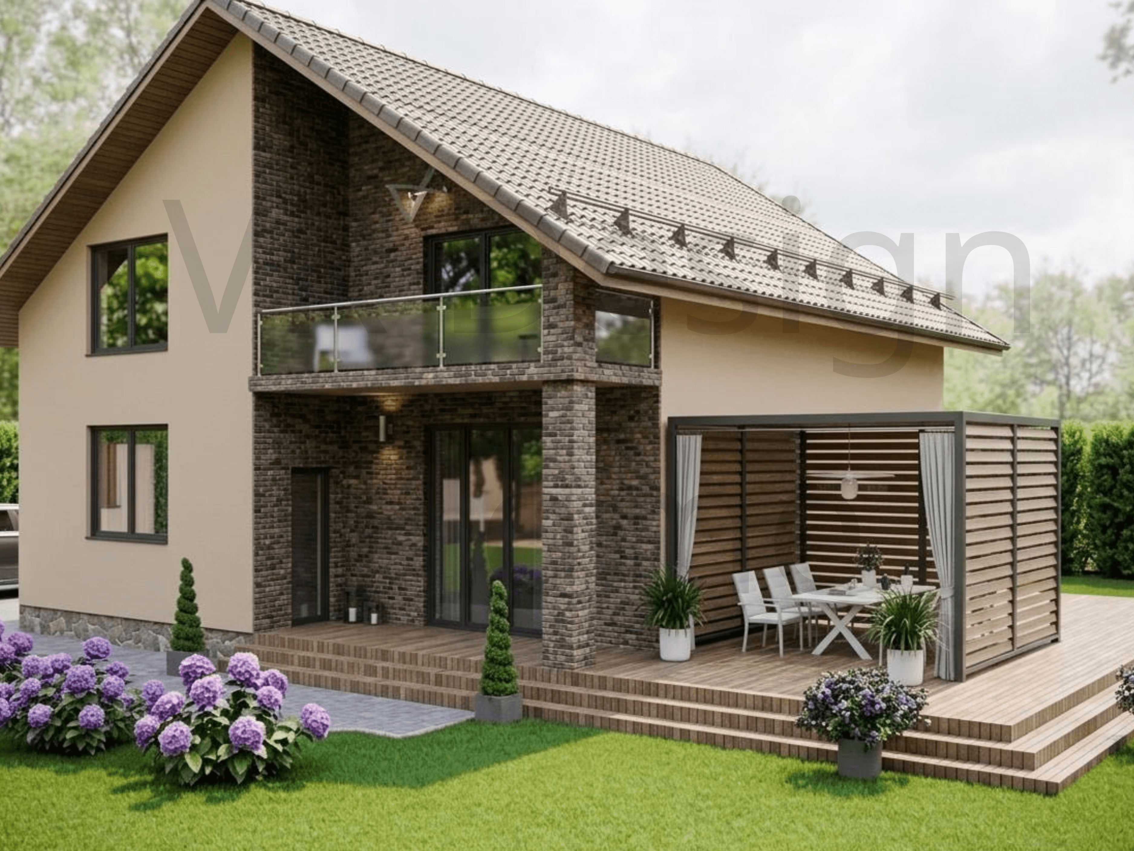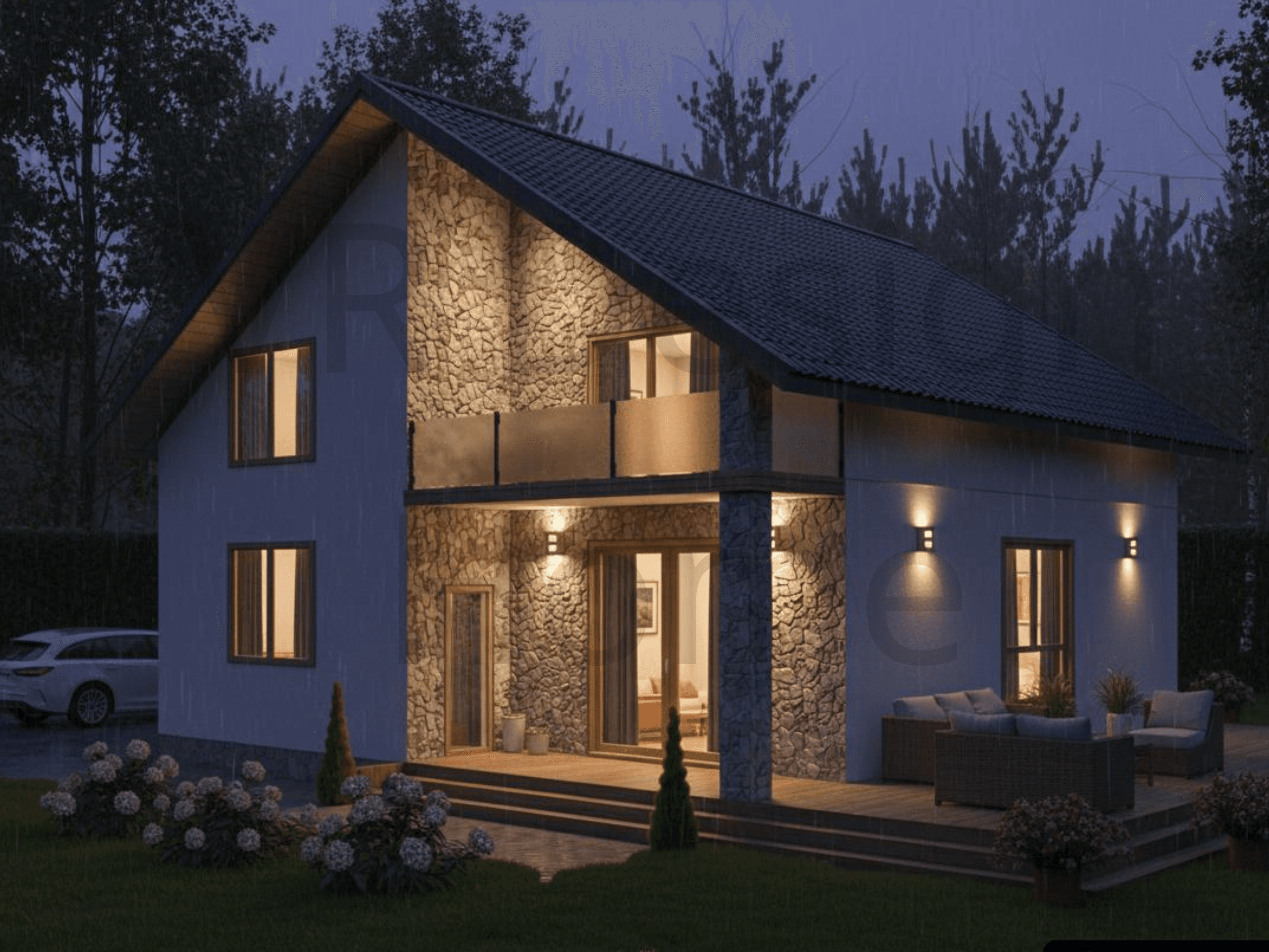 Представляем премиальный семейный проект «VR House 3» (203.5 м²): Этот особняк — воплощение европейской архитектуры с комбинированным фасадом (камень + декоративная штукатурка). Идеален для тех, кто ценит статус и простор. ПЛАНИРОВКА ДЛЯ БОЛЬШОЙ СЕМЬИ: 1 этаж (96.3 м²): Огромная кухня-гостиная с выходом на террасу, светлая гостевая зона. 2 этаж (107.2 м²): Три тихие спальни, видовой балкон и огромный семейный гардероб, который решит вопрос хранения вещей навсегда.