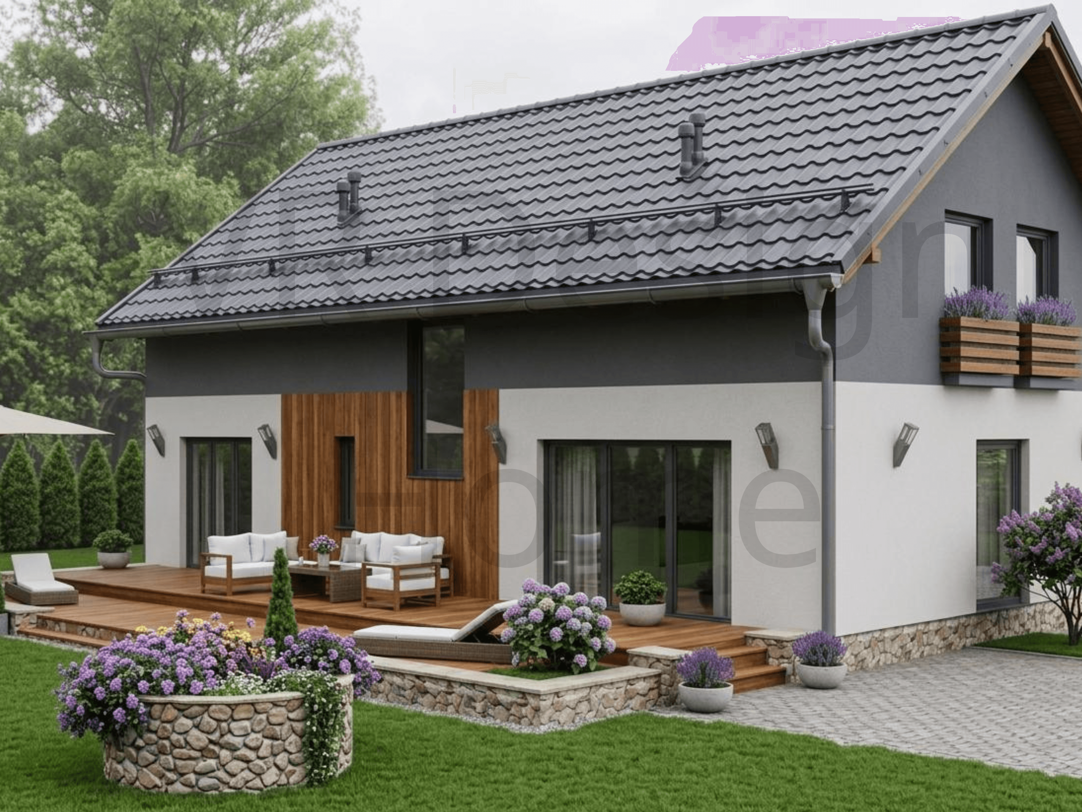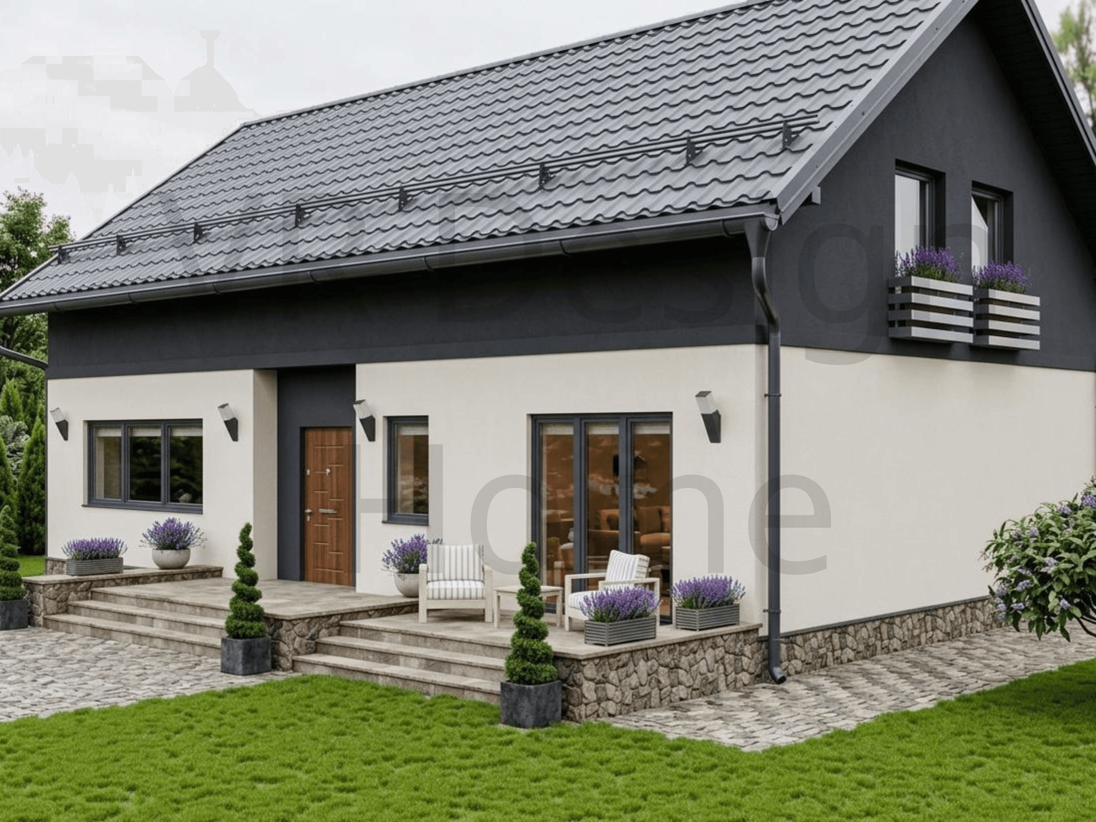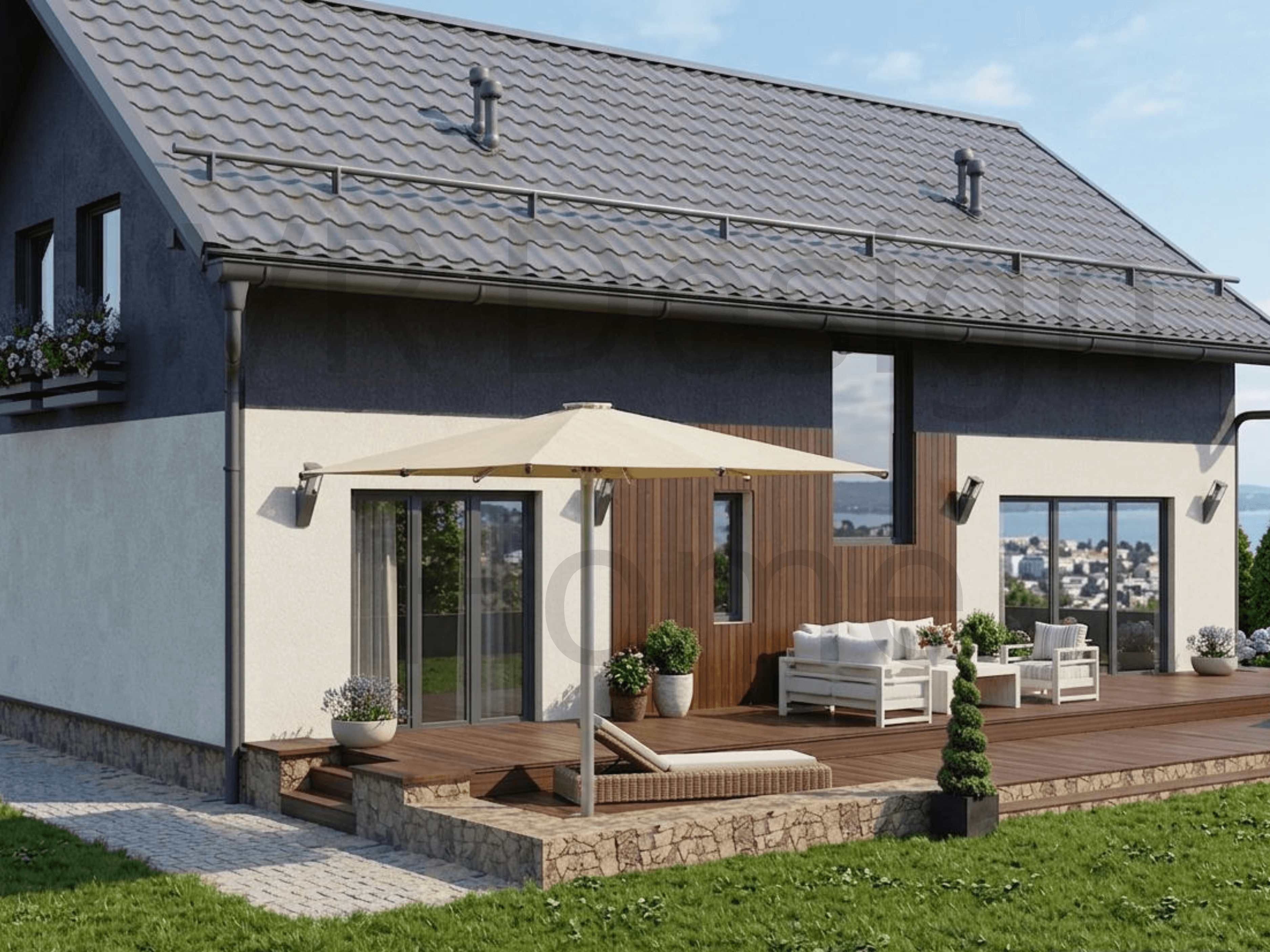 Проект VR House- 5 (184.2 м²) Дом 184 м² с 6 комнатами + Полный проект и Дизайн в подарок VR House- 5 — двухэтажный дом для тех, кому нужно много жилых комнат и открытое общее пространство. 184 квадратных метра полезной площади с рациональным зонированием. ПЛАНИРОВКА: Площадь застройки 114,7 м² * 1 этаж (91.2 м²): Кухня-гостиная 40 м² — единое пространство для отдыха и готовки. Кабинет для работы и отдельная гостевая спальня. Санузел, котельная и холл. * 2 этаж (93 м²): 5 полноценны[ спален. Большой семейный санузел.